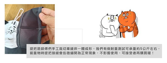● 每個袋子皆為師傅手工裁切車縫,尺寸略有不同,而提把為車縫非一體成形,可承重約5公斤,裝重物時提把接縫會些微繃開為正常現象,不影響使用,可接受者再購買喔!